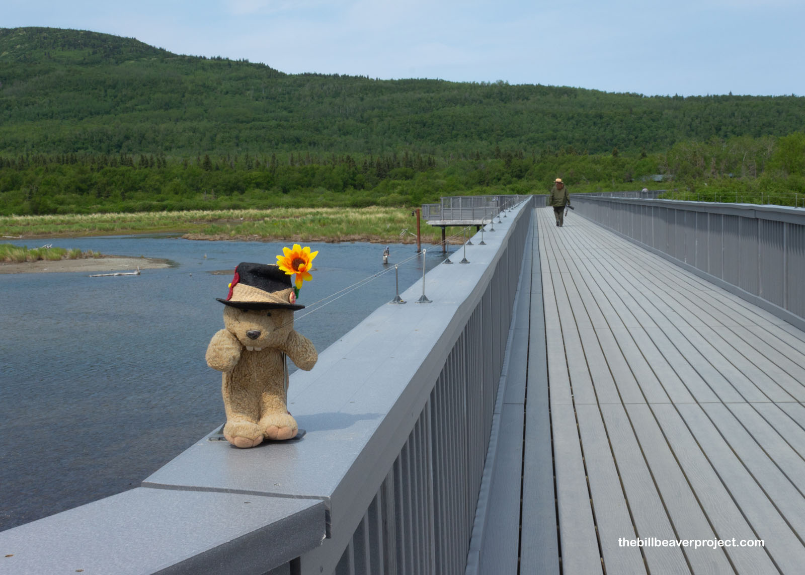So I continued my hustle down the boardwalk, past a ranger who was happy to see another traveling animal heading for the falls. Like human visitors, a fair number of us animal adventurers pass through Brooks Camp, and she said she liked guiding us along. At this moment, though, she was heading in he opposite direction and waved me on because it was already 2:45!