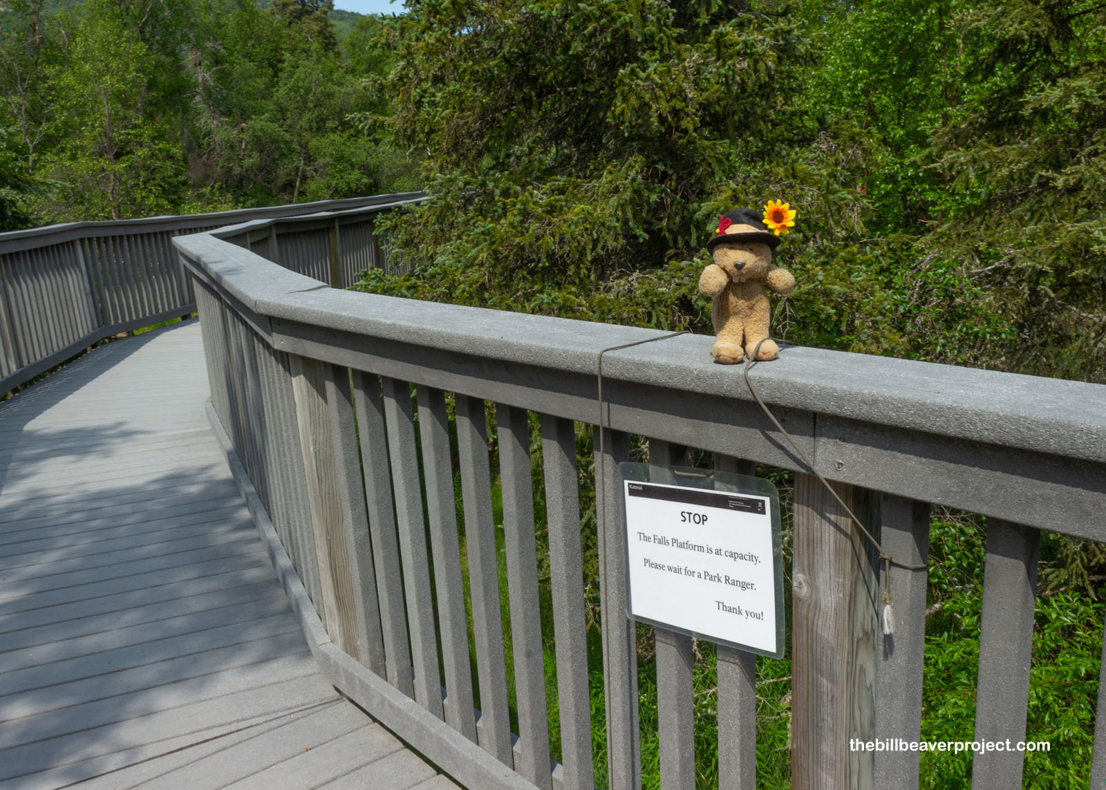 I made it to the platform gate without incident, seeing neither a single bear nor the wolverine that had been reported in these parts recently. I passed only four people the whole way. One said she’d seen a bear slide down the bank and cross the river, but that had been hours ago. All of this was a far cry from the high season, made extra clear when I bypassed the dangling chains where folks had to wait their turn during peak bear times!