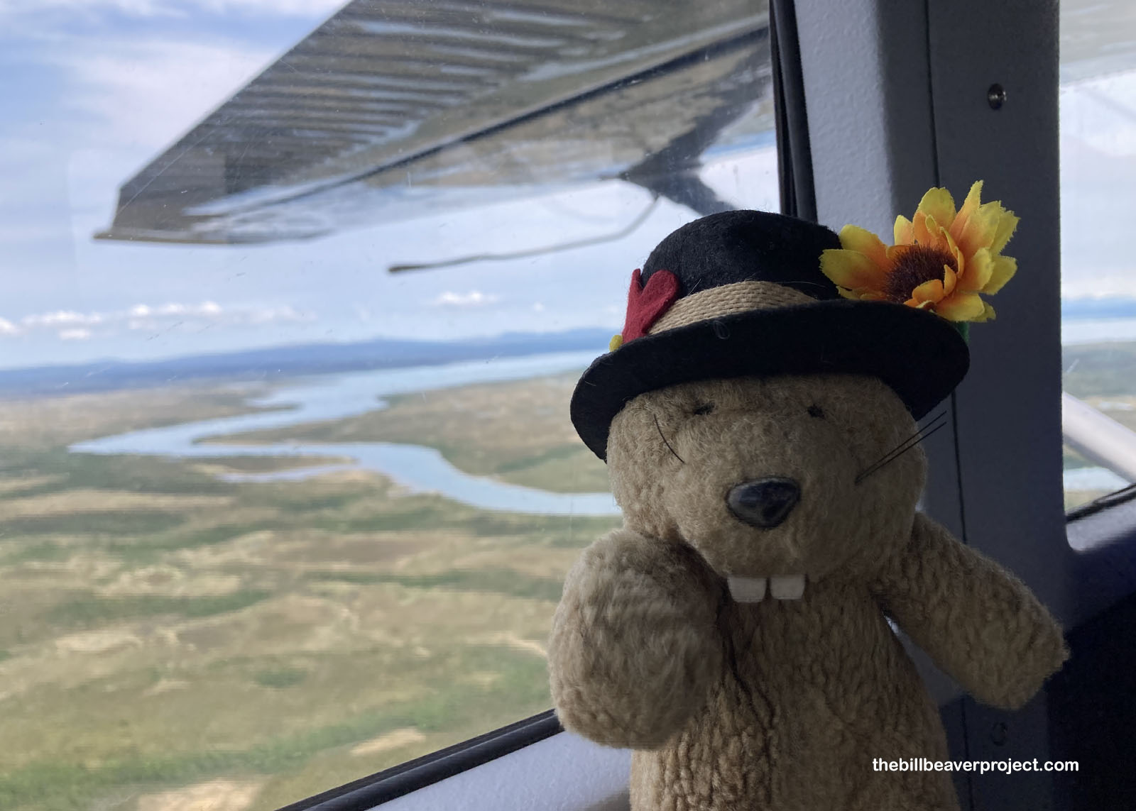 I walked the mile and a half back to my apartment, swarmed by summer flies, and shortly after lunch, Nanci texted me that a van was on its way to pick me up. Ha ha, flies! I joined white-haired Mr. and Mrs. Frey on a Cessna 206, co-piloted by Ian and Michael, my first time on a float plane! We motored out onto the Naknek River, and with a roar, the single propellor took us up, up, up, into the air. The terrain was flat to the horizon, covered at first by skinny pine trees that melted into vast, pond-speckled plains. From above, the many, many lakes, ponds, and streams make the ground look so fragile, like if you stepped on it, you’d break right through and send ripples out for miles! This idea was disproven by the lone bear far below, wading through one of those ponds without a second thought of breaking through the crust!