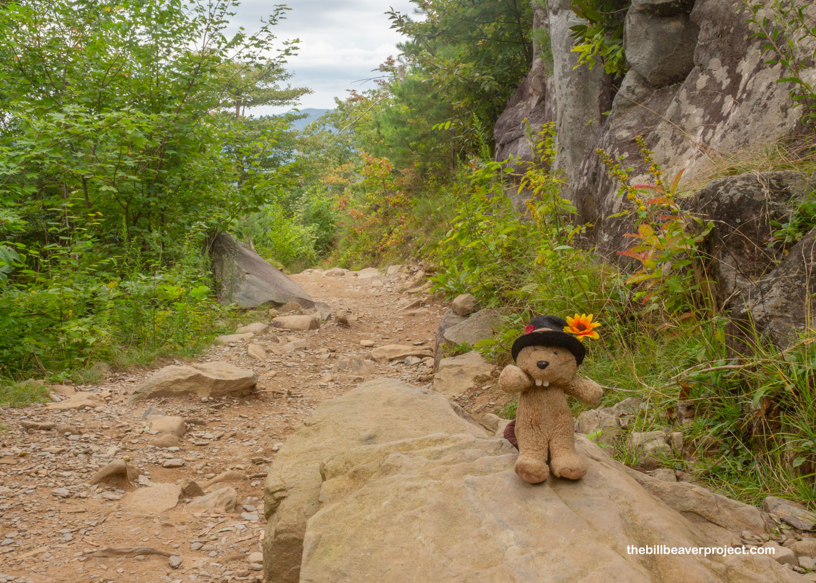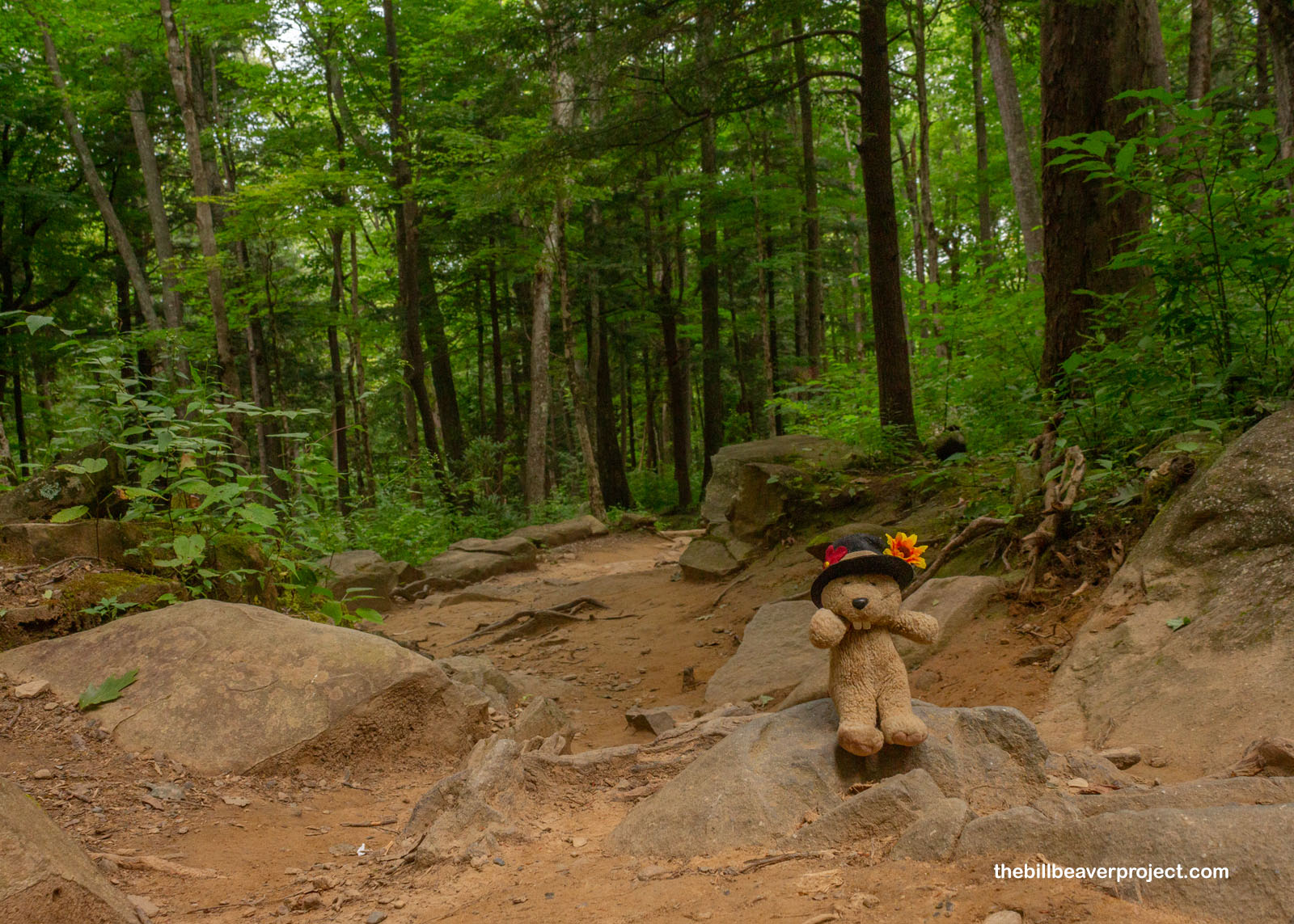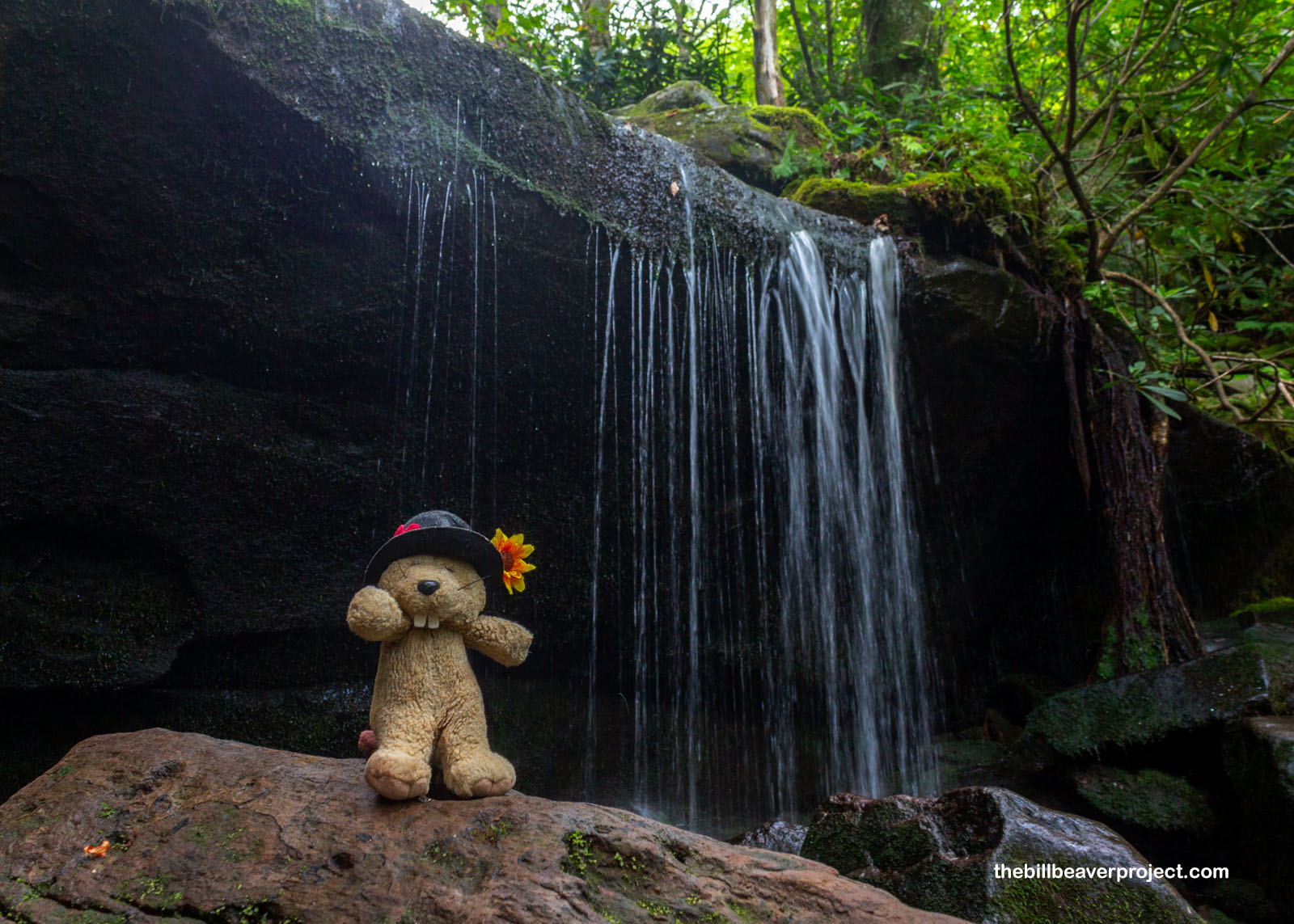 But she was an exception. There were plenty of groups of hikers camped out on the rocks beneath Rainbow Falls, and at least one social media influencer doing precarious yoga poses on a boulder. There was a group who decided to go up and sit under the falls, making it hard to photograph. I grouched about this with another furry hiker, Penelope the Opossum! She was much less grouchy than I, since she was just beginning to explore new places outside her native Texas and was enchanted by the beauty of this place, even with all the people around. There’s a lot to be learned from Penelope!