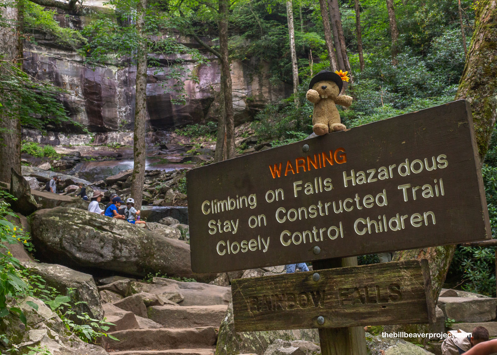 Now that’s how you know you’ve reached your destination: a warning sign! It shows that folks have confused natural features with a playground, and in fact, well below the falls, we watched a lady fall on her butt and get unceremoniously dragged off the boulder by her friend! It’s important to be careful when out in nature, because rocks are unforgiving!